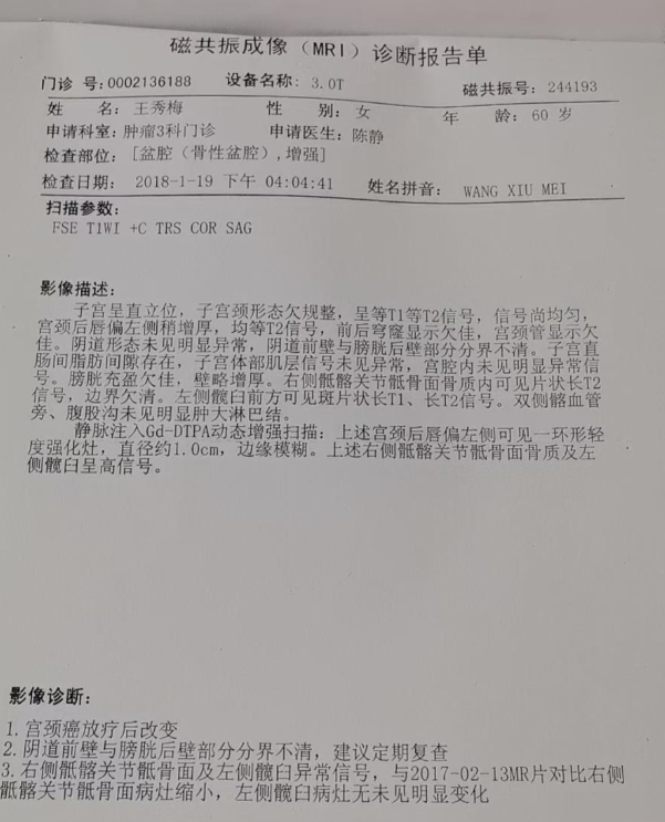 那是2014年12月,据老伴介绍:“是50多岁的时候,老伴打工的单位组织体检查出来的”,有一项指标异常,医生让去大医院活检一下,完善检查后,确诊“宫颈鳞癌”。