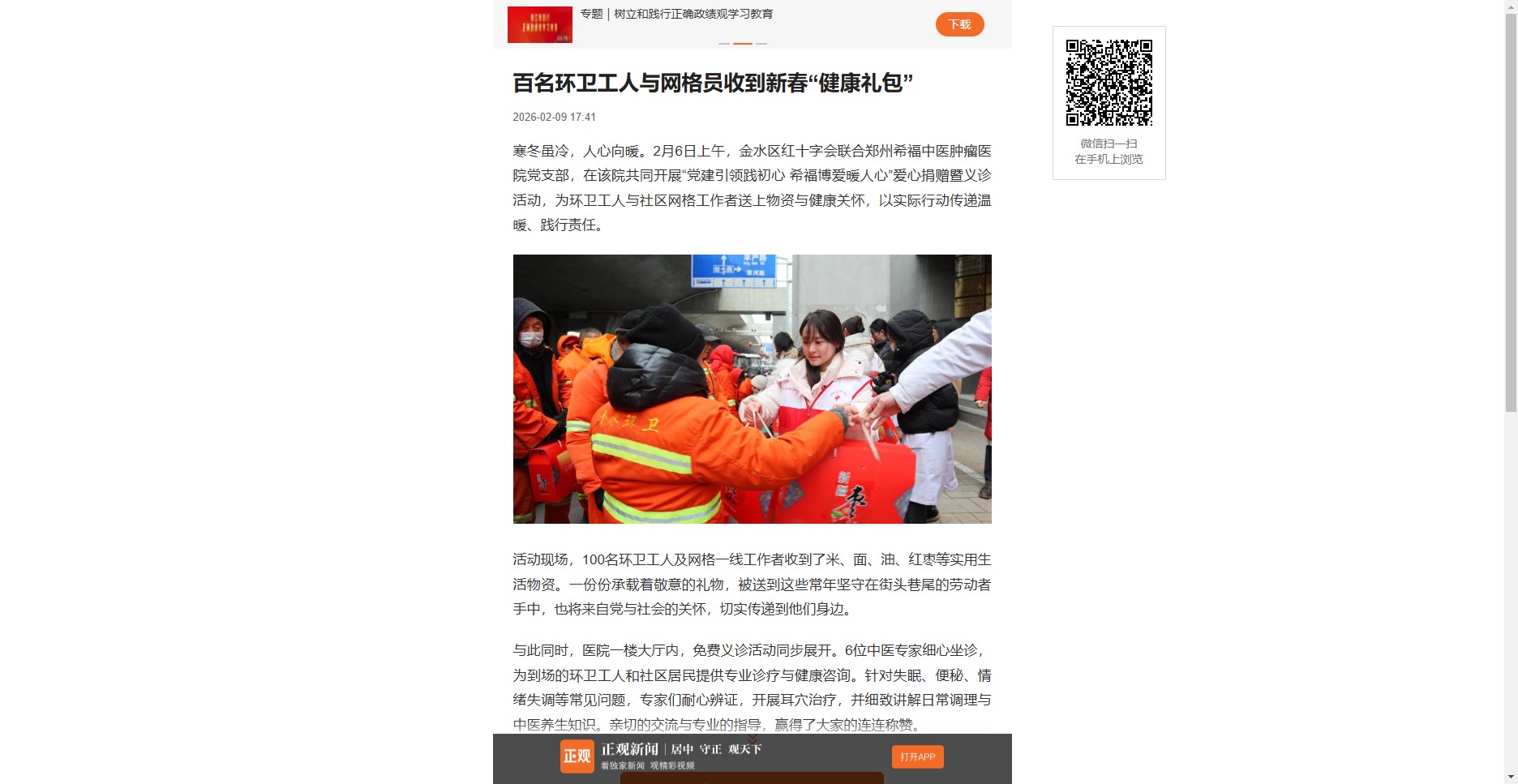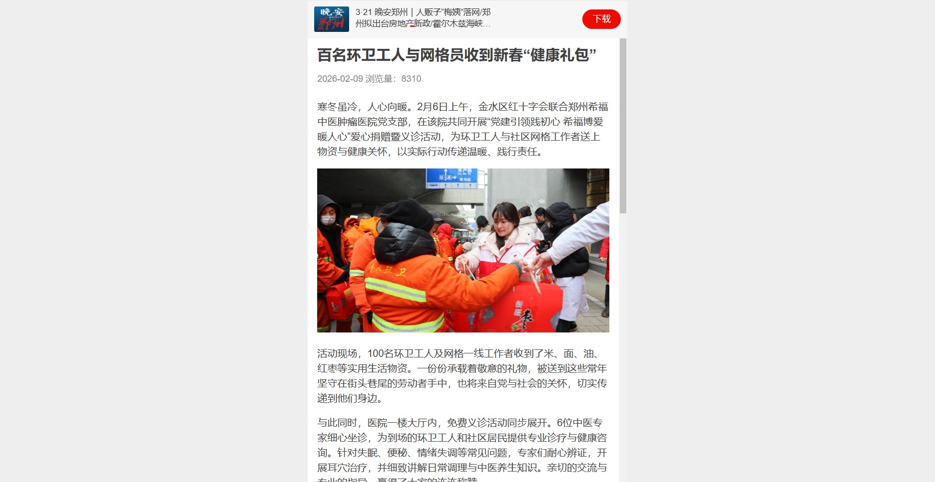 寒冬虽冷,人心向暖。2月6日上午,金水区红十字会联合郑州希福中医肿瘤医院党支部,在该院共同开展“党建引领践初心 希福博爱暖人心”爱心捐赠暨义诊活动,为环卫工人与社区网格工作者送上物资与健康关怀,以实际行动传递温暖、践行责任。